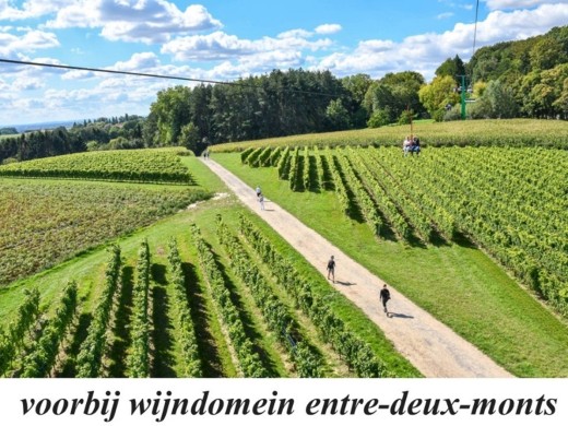 Onze lange eet-drank en rustpauze heeft deugd gedaan. Aan de kerk van Loker buigen we af en starten enkele zware beklimmingen. We moeten over de West-Vlaamse heuvels…. De Baneberg is de eerste helling en begint heel langzaam tussen de wijnvelden van “Entre-Deux-Monts”. Na wat zwoegen zijn we op de Rodeberg. Nabij de top staat de Lijstermolen. Iets verder bij de Vidaigneberg bevindt zich een stoeltjeslift, deze zweeft over het dal en de wijnstokken. Nu naar de Zwarteberg, pal op de grens met Frankrijk. Hier moet ik spontaan terugdenken aan mijn 1° grote tocht naar Santiago de Compostela. Hugo, mijn schoonbroer en één van de 4 Camino-fietsers, zag de plaat met “France” en spurtte als eerste over de grens, maar enkele 10-tal meter verder stond hij na enkele vloeken stil. Zijn versnellingsapparaat weigerde toen al voor het eerst! God zal het geweten hebben!