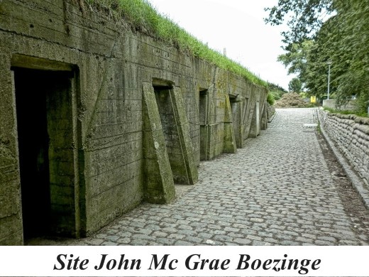Bij het kanaal Ieper-IJzer of is het Ieperleekanaal? Moeten we over het Sas van Boezinge.  Dit is een historisch sluizencomplex met verdedigingswerken. Het kanaal is 14 km vanaf Ieper tot de Knokkebrug, waar het in de IJzer uitmondt. Langs de boorden van dit kanaal fietsen is een zaligheid met een verrassend gevarieerd landschap. We rijden wat trager en zoeken de oorlogskanaalsite John McCrae. Ik weet dat er in de kanaalberm een weggetje loopt tot vlak bij de militaire begraafplaats Essex Farm Cemetery. Net ten noorden van de begraafplaats bevinden zich betonrestanten van een medische post en is een monument opgericht voor John McCrae en zijn gedicht In Flanders Fields, dat hij hier zou hebben geschreven. Er is verrassend veel volk op bezoek, het zijn allemaal Engelssprekenden, vol bewondering wat er allemaal bewaard is van die verschrikkelijke oorlog.