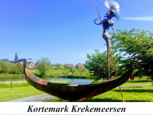 Wanneer we de boswegels verlaten zijn we in Kortemark, dorp van vele molens.  In het centrum van Kortemark bevinden zich De Krekemeersen. Hier willen we toch kost wat kost onze dorst lessen, ik weet dat er pal in het dorpscentrum een echt volkscafé is. De gemeentearbeiders wijzen ons de weg naar café ’t Oud Cortemarck. Wat kan een tripel deugd doen! Mijn fietsmaatje, wordt er uitbundig van……”Iedereen spreekt hier West-Vlaams”. Laat hij zich met verwondering ontvallen. Rik is een geboren West-Vlaming en uitgeweken naar het Antwerpse en wordt er zelfs emotioneel van, zijn echte moedertaal te horen! We blijven maar kletsen met de tooghangers, tot we beseffen dat we vandaag nog in Ieper moeten geraken. Met moeite laten ze ons vertrekken, wat een gezellig boeitje was dat jongens! We peddelen verder door het natuurgebied van de IJzer- en Handzame vallei naar de Vrijbosroute een fietssnelweg langs een oude spoorwegbedding. Door een idyllisch landschap komen we voorbij “Station De Geite”. Dit is een voormalig stationnetje aan gesloten spoorlijn 63.