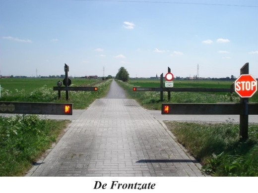 Het is fris, maar prachtig fietsweer. Nu in noordelijke richting tussen de weidse velden naar de Lovaart. Dit is een kanaal welke een verbinding vormt tussen het Kanaal Nieuwpoort-Duinkerke en de IJzer nabij Fintele. Deze vaart is 14 km lang en doet dienst voor plezier vaart en als afwatering voor het overtollig water uit de IJzer. Nu voorbij de brug van Alveringem tot aan de voetgangersbrug. Hier dwarsen we de Lovaart richting Lampernisse. Een klein stil dorpje midden vlakke graslanden. Na 15 kilometer zijn we aan de Frontzate. Dit is een kaarsrechte groene as van zo'n 13 km door rustige polders. Hier zie je vele restanten uit de eerste wereldoorlog. Deze oude spoorlijn verbond Kaaskerke met Nieuwpoort.