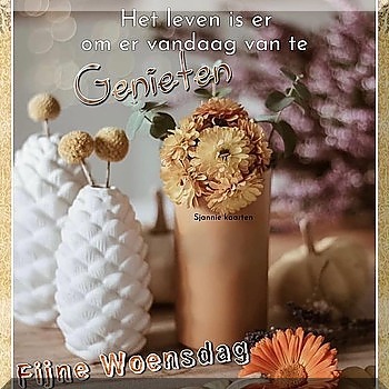 We zijn al weer in de helft van de week ...weer een stukje verder naar het het beloofde zonnige weekend  op )Ola ... dat is vooruit willen crossen in de tijd en zoiets hebben we in de loop der jaren  wel  afgeleerd ... wij senioren  leven braafjes dag per dag en proberen dan ook te genieten van die dag ! Oei... is dat weer ouwe meekespraat vandaag ??? Och dat moet ook eens kunnen è! Maar zal er toch maar mee ophouden voor nu want wil je nog een heel gezellige dag wensen en vooral geniet ervan !