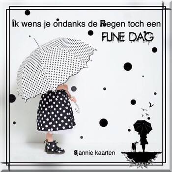 Vandaag ... rregen ! Als je nu daarboven denkten dat zoiets op mijn humeur inspeelt ... niets van ! We houden hier natuurlijk ook veel meer van een zonnig weertje maar men dag laten verpesten door de regen ... mij niet gezien hoor ! Waarom dient ons parapluke anders voor dus word het( meschien ) boodschappen doen a la " singing in the rain" !Stoort me totaal niet en ...een overdekt terrasje met verwarming voor een koffietje daar zal ook wel nog een plaatsje vrijn zijn !Dus ...laat ook niet je dag verpesten door het weer en daarom wens ik jullie een ...