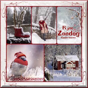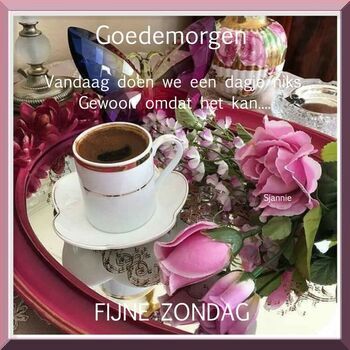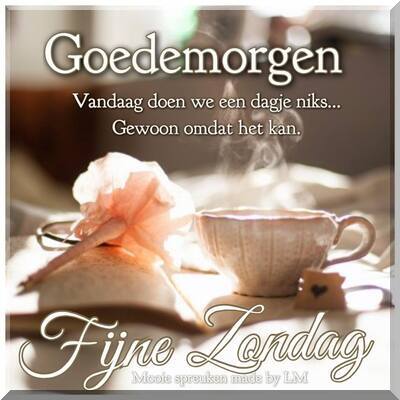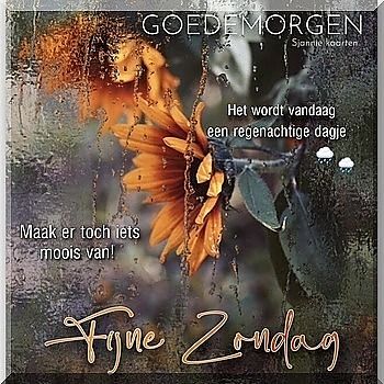 van laat je niet teneerslaan door dat grijze weer , het is Zondag rust of wandeldag of wat ook de plannen zijn voor va ndaag ... die weekend dagen zijn er om van te genieten ! En dit of dat die ( zogezegd ) dringend moet gedaan worden ??? niets loopt weg en morgen is er een nieuwe dag! Kortom geniet van je dag en maak er zoals iedere Zondag een verwendag voor iedereen in je omgeving en ook voor ... jezelf !