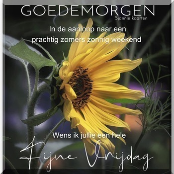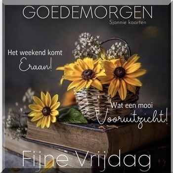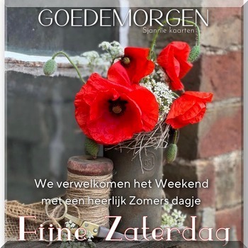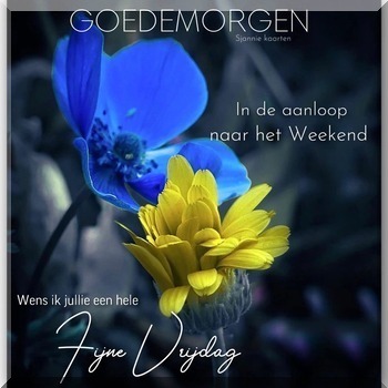 Op de laatste dag van de werkweek ! Zouden we nu niet een beetje met onszelf moeten lachen als we " werkweek " zeggen ???? Verdraaid wat zitten die woorden toch diep ingebakken van vroegere jaren toen we een druk leven hadden en die Vrijdag dan betekende ..." even op adem komen in het Weekend !Maar we blijven ook nu nog steeds het Weekend in ere houden zoals vroeger en we genieten er evenveel van als toen ! Maar zo komen we terug bij het begin ... we gaan er nog tegenaan voor vandaag want het is maar morgen Weekend !!!!