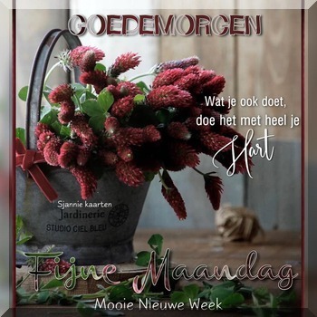 Zoo zijn we weer de onbekende weg van een nieuwe week gestart , we hopen zoals iedere start dat het een week zonder al te veel zorgen word !Maar daar denken we nog niet teveel aan want zo verpest je het nu ; we zullen wel zien wat de dag en de volgende dagen ons zal brengen !è Voorlopig moeten we het nog doen zonder zon maar we blijven optimiste ... wat niet is kan nog komen ! Maandag wil zoals iedere week ook zeggen ... klusjesdag en na dat even op adem komen met een koffietje ( en ff loeren op de blog ) vliegen we er weer in ! Ook al is het maandag niet vergeten ...geniet toch van de rest van je dag !!!!