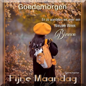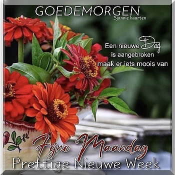 We beginnen een nieuwe week ... al zijn dit wel nutteloze woorden op dat plaatje want we weten dit ondertussen allen wel ,die dag is al een stukje gevorderd dus dat eerste lijntje was overbodig Maar het tweede lintje " wens jullie allen alvast een mooie Maandag " dat is wel van belang ! Om die woorden nog wat kracht bij te zetten is daar de zon ( hier toch) en als we die zien dan is dat een goed teken om van je dag er het beste van te maken !Amaai wat een gekrabbel over een simpel zinnetje vandaag waar 4 woorden volstaan ... GENIET VAN JE DAG !Voila en daarmee is alles wat de bedoeling hier was voor deze Maandagse voormiddag en dag volbracht !