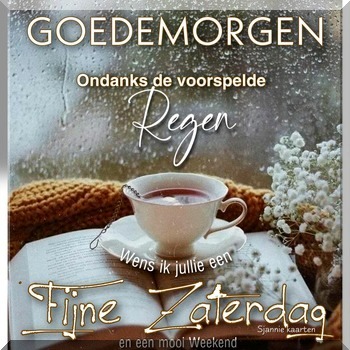 " Want zelfs op deze regendag wens ik ju een heel goede morgen " Soms hangt alles af wat er nog op de rest van die dag gebeurt af van hoe je die dag start ! Een goede start en de touwtjes wat vieren omdat we in het Weekend zoiets mag ...kan niets anders dan een goede dag worden ( zelfs die regendag ) Dat wens ik dan ook iedere van harte ondanks het rotweer toch een gezellig Weekend !