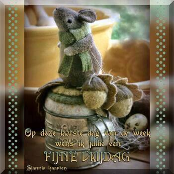 We zijn aan de laatste dag van die werkweek ... ook al zegt die jongere generatie dat wij senioren alle dagen Weekend hebben kijken wij ook toch nog steeds uit naar het Weekend zoals vroeger en ... net zoals zij dat ook doen ! Al verloopt ons Weekend nu wel een stukje rusiger we kunnen er nog steeds evenveel van genieten als vroeger !Maar dat is weer vooruit lopen op de tijd zover zijn we nog niet dus maak er vandaag ook maar een gezellige dag van!