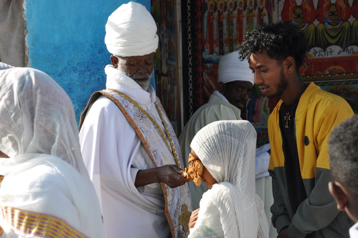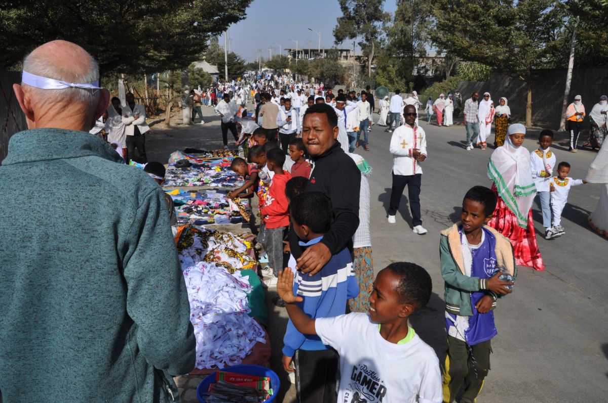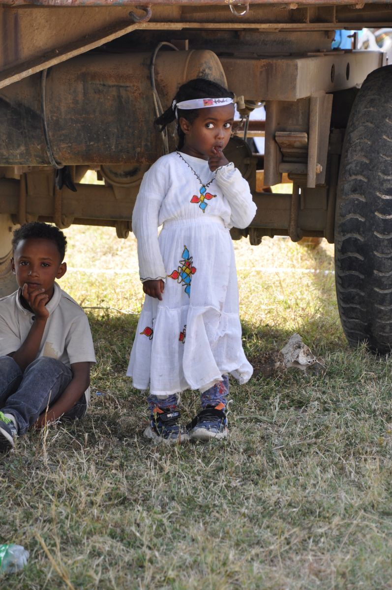 We hebben weer geluk : In de Debre Berhan Selassie (Berg van de verlichte drievuldigheid) is het festival van de "trinity" vandaag juist begonnen. De kerk heeft prachtige fresco's (17de en 18de eeuw) en de zoldering telt 80 engelengezichten.Tussen al die in het wit geklede gelovigen waren wij de enige westerlingen en we mochten overal binnen (maar onze meisjes wel langs een andere deur).