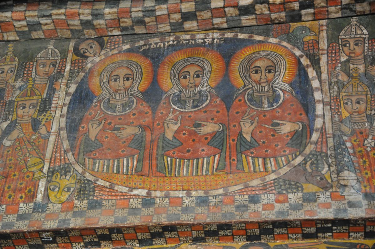We hebben weer geluk : In de Debre Berhan Selassie (Berg van de verlichte drievuldigheid) is het festival van de "trinity" vandaag juist begonnen. De kerk heeft prachtige fresco's (17de en 18de eeuw) en de zoldering telt 80 engelengezichten.Tussen al die in het wit geklede gelovigen waren wij de enige westerlingen en we mochten overal binnen (maar onze meisjes wel langs een andere deur).