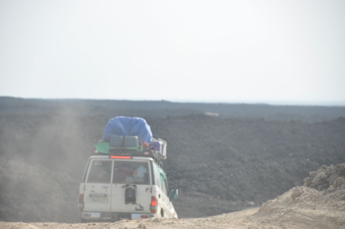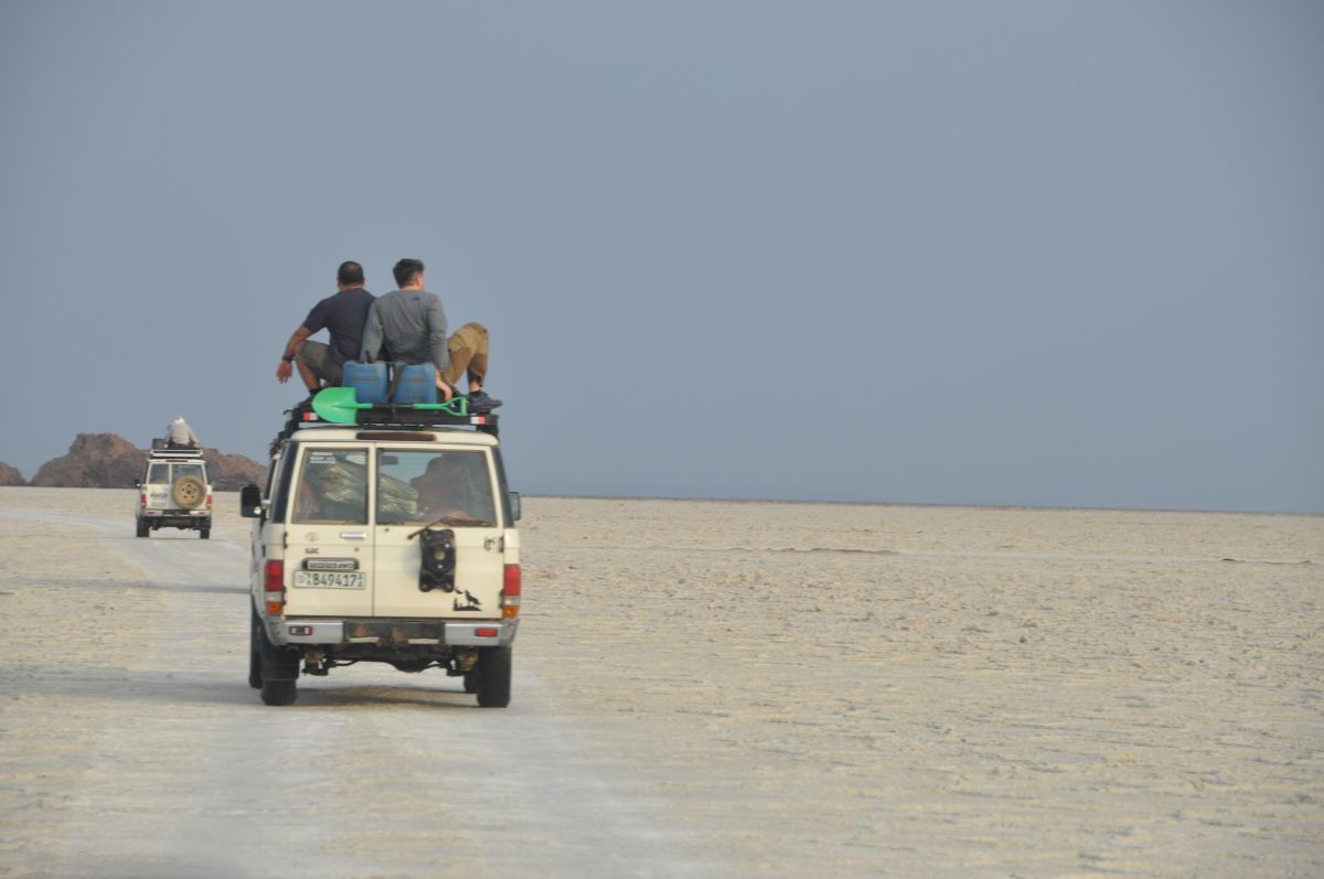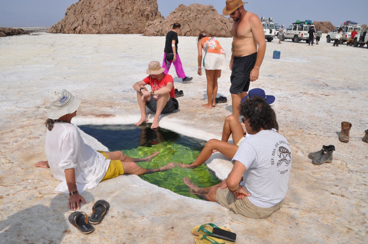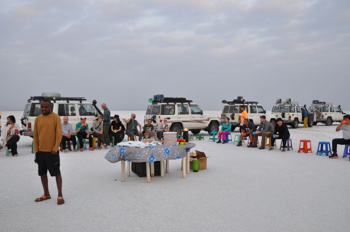 's Morgens ontbijt op de zoutvlakte. Erg speciaal! Dan naar Danol voor de zwavelhoudende gheisers, een wonderbaar natuurverschijnsel: de kleuren zijn prachtig. En een tof voetbad in de zoutkristallen...Dan rijden we een fameus schokkende rit naar de Erte Ale vulkaan (de vulkaan is enkele jaren geleden ingestort..dus geen gloeiende lava) om er onze camping op te zoeken (zie morgen)...