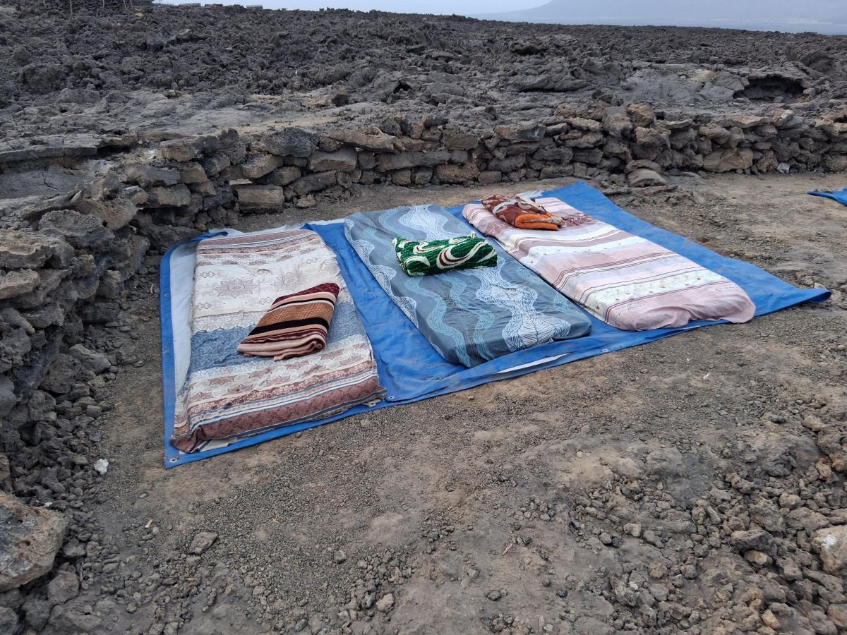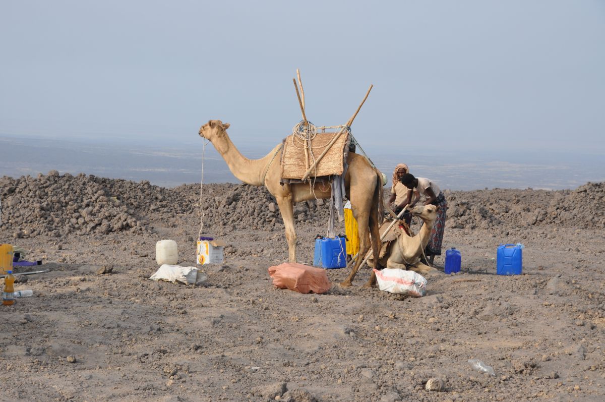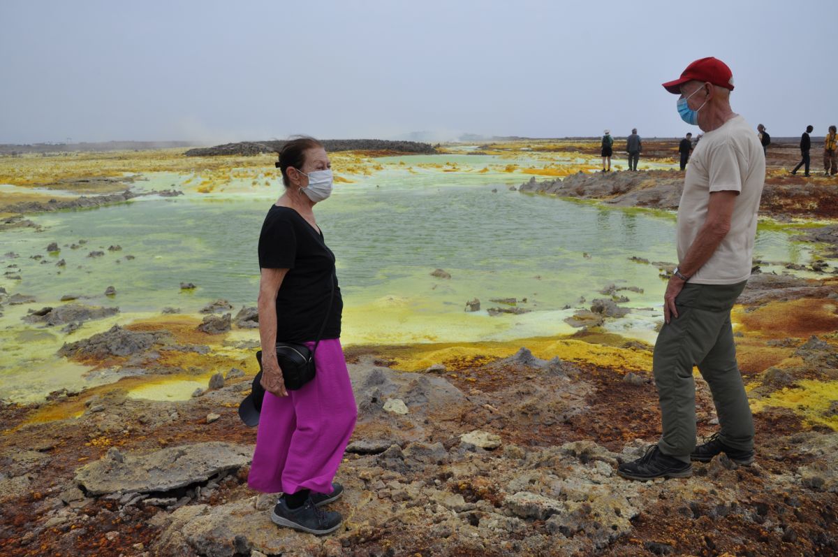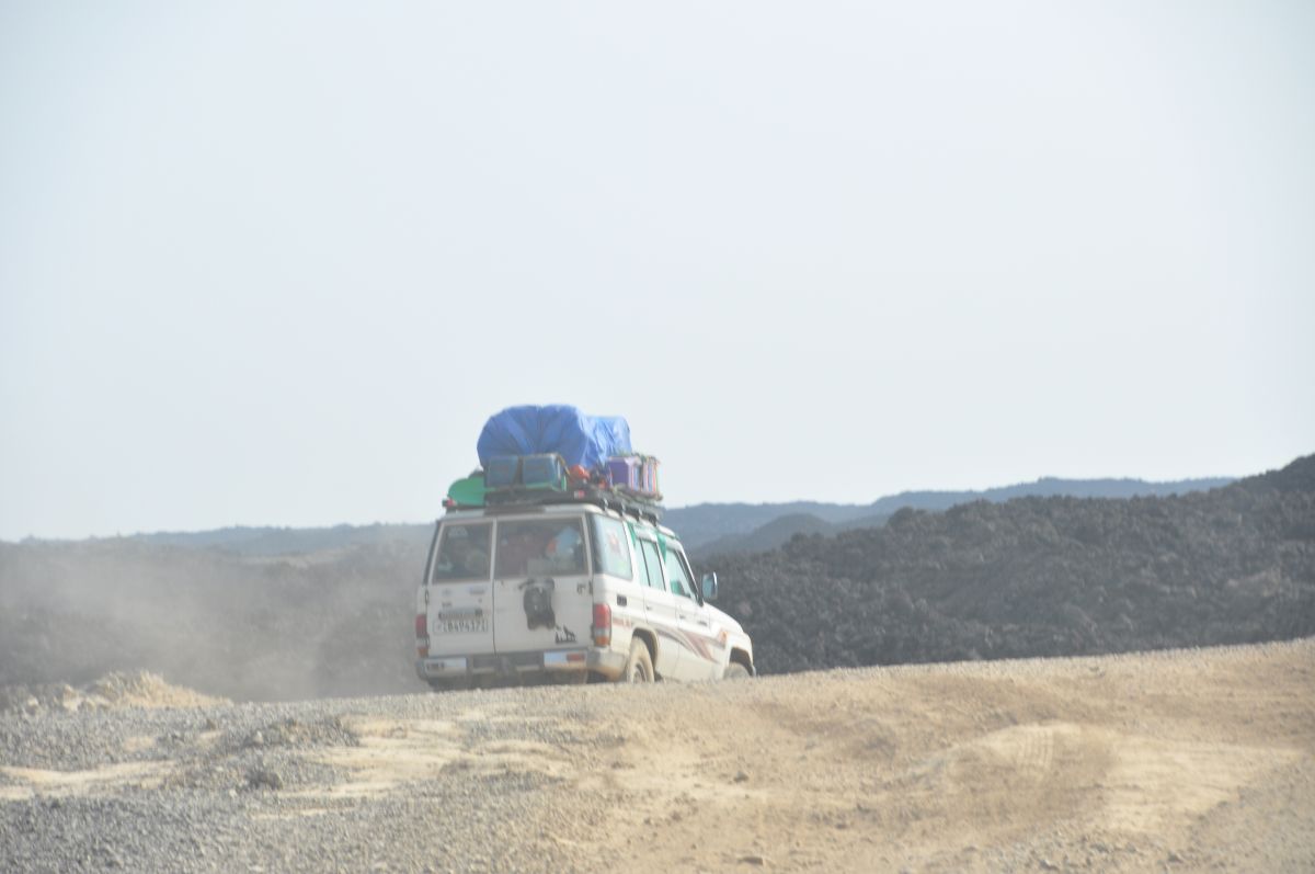 's Morgens ontbijt op de zoutvlakte. Erg speciaal! Dan naar Danol voor de zwavelhoudende gheisers, een wonderbaar natuurverschijnsel: de kleuren zijn prachtig. En een tof voetbad in de zoutkristallen...Dan rijden we een fameus schokkende rit naar de Erte Ale vulkaan (de vulkaan is enkele jaren geleden ingestort..dus geen gloeiende lava) om er onze camping op te zoeken (zie morgen)...
