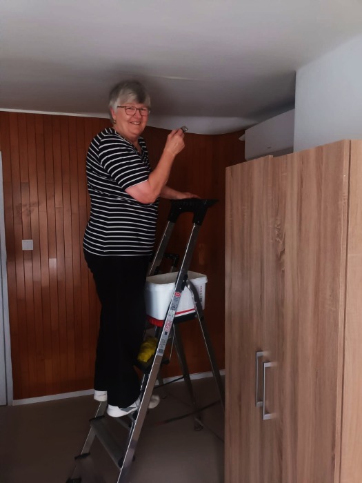 Donderdag naar de kleindochter geweest, de man met de pomp was nog aangekomen voor zij vertrok naar haar werk! De kelder is één grote ruimte van de dubbel appartementen, dus heel groot, en er stond grondwater tot boven de enkels in Dus die man is heel lang bezig geweest! Ondertussen wou ik ook nuttig zijn en heb al haar ramen gezeemd. Die van de living zijn geen simpele die gaat in 't midden open! maar heeft nog grote zij kanten Daar was ik om 16u30 mee klaar, en was na 20km op en af fietsen weer thuis Kreeg na haar schift nog een berichtje "ramen waren spic en span " Heb de kelder nog niet gezien, maar wel de deur er naartoe, die meer dan een sopke nodig heeft Morgen ga ik terug om de kelder verder proper te maken, en die deur af te wassen.