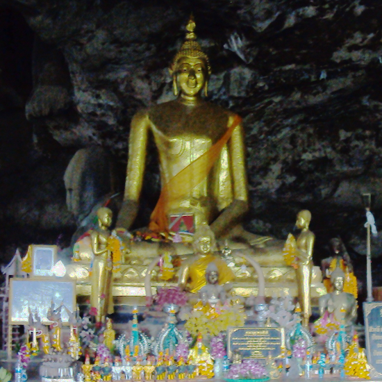 We boeken een tour naar de brug, het Erawan National Park (bekend om zijn watervallen), een grot met een groot boedhabeeld en een rit met de trein over de befaamde brug. Tussen haakjes: bij de eerste treinrit stortte de brug in (met trein en al) en doodde de inzittenden van de trein plus een aantal (dwang)arbeiders die nog aan het spoor werkten. Was het sabotage of het gevolg van haastwerk?