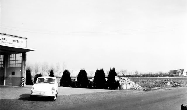 Men ziet hier nog een tipje van de autokeuring, toen nog automobiel inspectie genoemd, zoals het opschrift toont. Het was achter de sparren dat het huis ging komen.