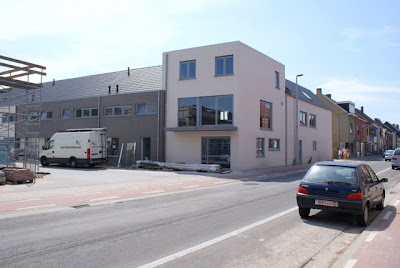 Zo ziet het er tegenwoordig uit. Het rode huis is dus blijven staan en daar stond de benzinepomp. Het huis in het midden is dus het nieuwe huis waarvoor de aanvraag werd ingediend. Het rechtse stuk, waar dus nu de krantenwinkel is, kwam er volgens mij iets later bij. Daar was het kantoor van bedrijf De Backer. Men ziet nog een glimp van de appartementen. Daar stonden dus die oude huisjes van op bovenstaande foto's.