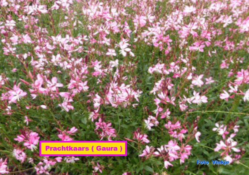 De prachtkaars (Gaura lindheimeri) is een langbloeiende vaste plant die bloeit met witte of roze bloemen van juni tot september. Deze plant gedijt het beste op een zonnige of halfbeschaduwde plek in goed doorlatende grond. Het is een onderhoudsvriendelijke en winterharde plant, ideaal voor borders. De beste tijd om de prachtkaars te planten is in het voorjaar of vroege najaar, met ongeveer zes planten per vierkante meter.