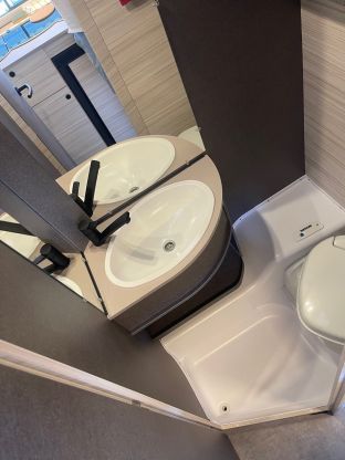 De badkamers in de c’joy ACTIVE zijn volledig uitgerust. Nieuw zijn de stijlvolle zwarte kranen en de standaard warmwatervoorziening. Sommige hebben een afzonderlijke douchecel of een waar de wand kan opzij draaien. De wc’s zijn gebruiksvriendelijk opgesteld en rond het waskommetje zijn een spiegel een bergvakken voor toiletgerief.