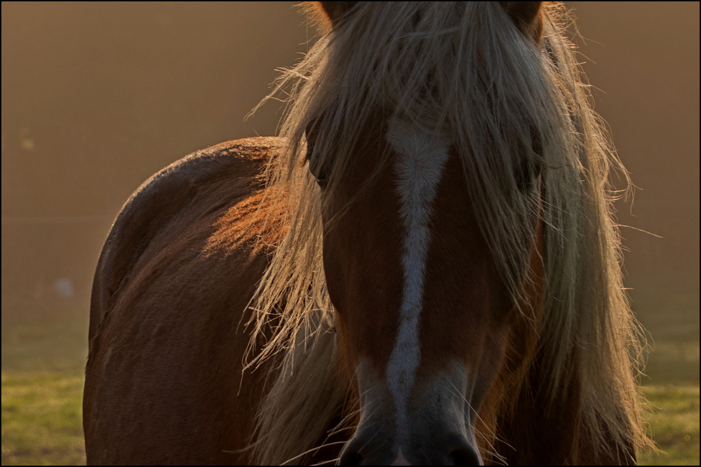 Gisteren deelde ik een reeks zwart-wit detailfoto’s waarin dit prachtige model centraal stond. Vandaag laat ik hem in kleur zien, gevangen in het zachte tegenlicht van de ochtendzon. De manen lichten op, de vacht krijgt een gouden gloed – precies dat spel van licht en detail dat in zwart-wit een ander verhaal vertelde, maar hier de warmte en levendigheid benadrukt.
