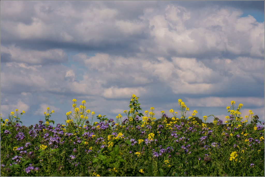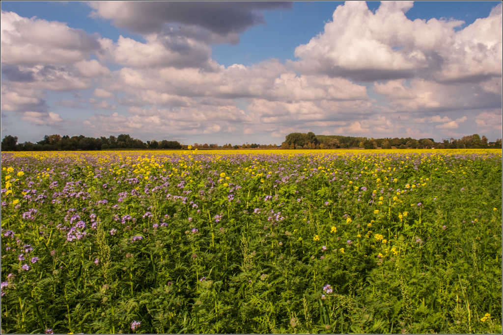 Een bont tapijt van paars en geel vult het veld — het bijenbrood en de veldmosterd bloeien uitbundig in de beginfase van de herfst. Tussen het gezoem van bijen en de geur van bloemen lijkt het een paradijs voor insecten, maar deze pracht heeft ook een doel. Later wordt dit veld ondergewerkt als groenbemester: de planten voeden de bodem en bereiden haar voor op een nieuw groeiseizoen. Schoonheid met een functie — natuur en landbouw hand in hand.