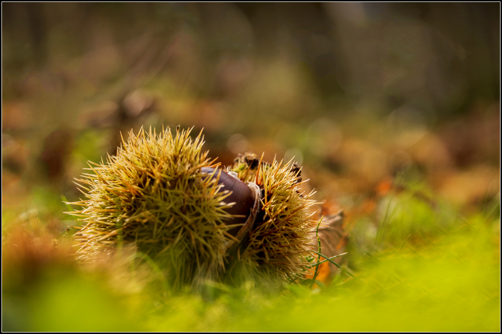 In deze opname ligt een kastanje, nog half verscholen in haar stekelige bolster, tussen het vochtige mos van de bosbodem. Het lage standpunt en de beperkte scherptediepte trekken de aandacht naar het onderwerp, terwijl de achtergrond vervaagt tot een zacht spel van herfstkleuren. Een stil moment waarin de herfst zijn vergankelijke schoonheid toont.