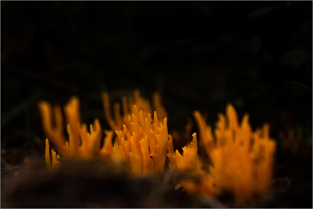 Tussen het mos en de bladeren in het Maldegemveld steekt deze feloranje koraalzwam haar ranke takjes omhoog. In het zachte licht komen de warme oranje tinten van de koraalzwam tot leven. Door de lage standpuntkeuze ontstaat een perspectief alsof je zelf tussen de vlamachtige vormen staat. De donkere achtergrond versterkt het contrast en laat het onderwerp bijna gloeien in het duister.