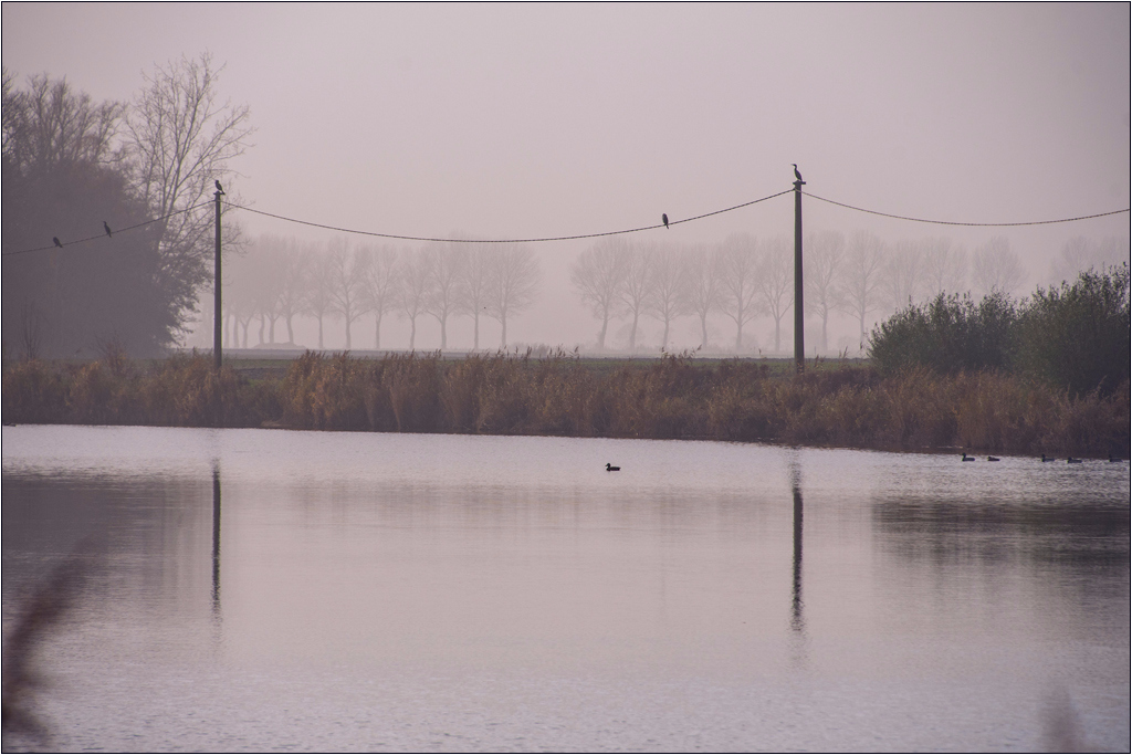 Namiddagopname aan de Hollanderskreek, met diffuus nevellicht dat zachte contrasten en pasteltonen geeft. De telelens comprimeert het landschap, terwijl palen en draden een grafisch element vormen. De subtiele weerspiegeling in het rustige water versterkt de verticale lijnen in het beeld.