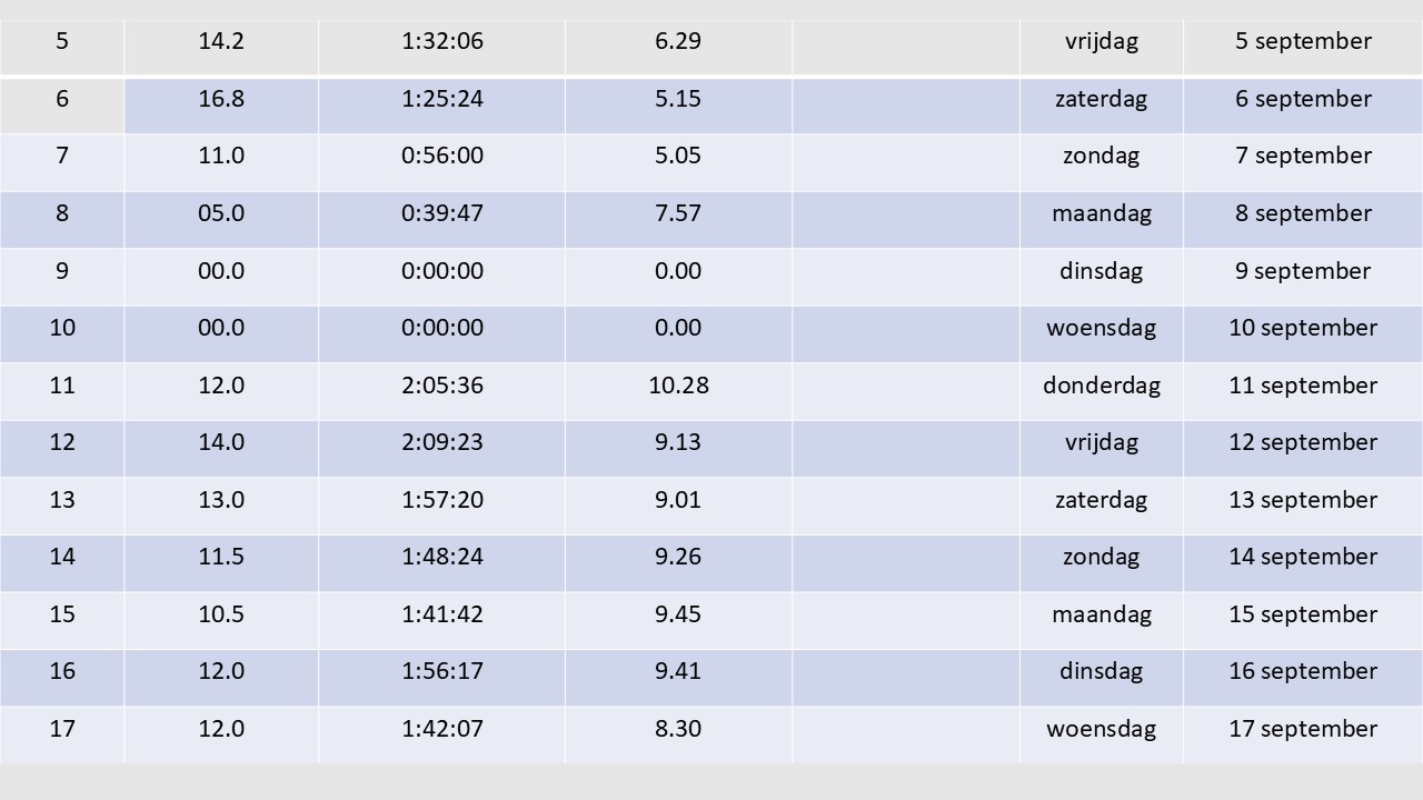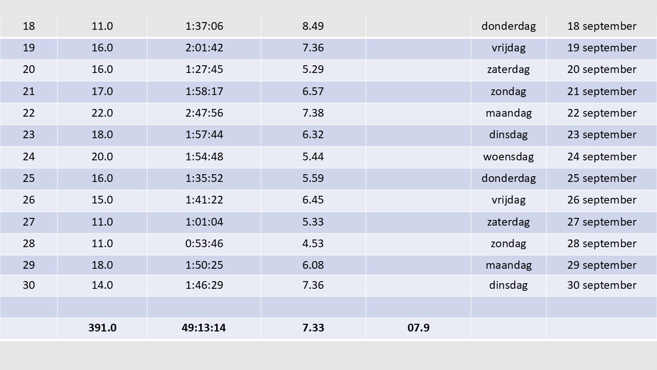TR285 – afstand 18km000 – chrono 1:50:25 –  km-tijd 6.08 - calorieën 1130 – temperatuur 18,3° - gewicht 59,2 kg – hartslag 81-154  – pasfrequentie 172 – opnieuw prima nazomerweertje