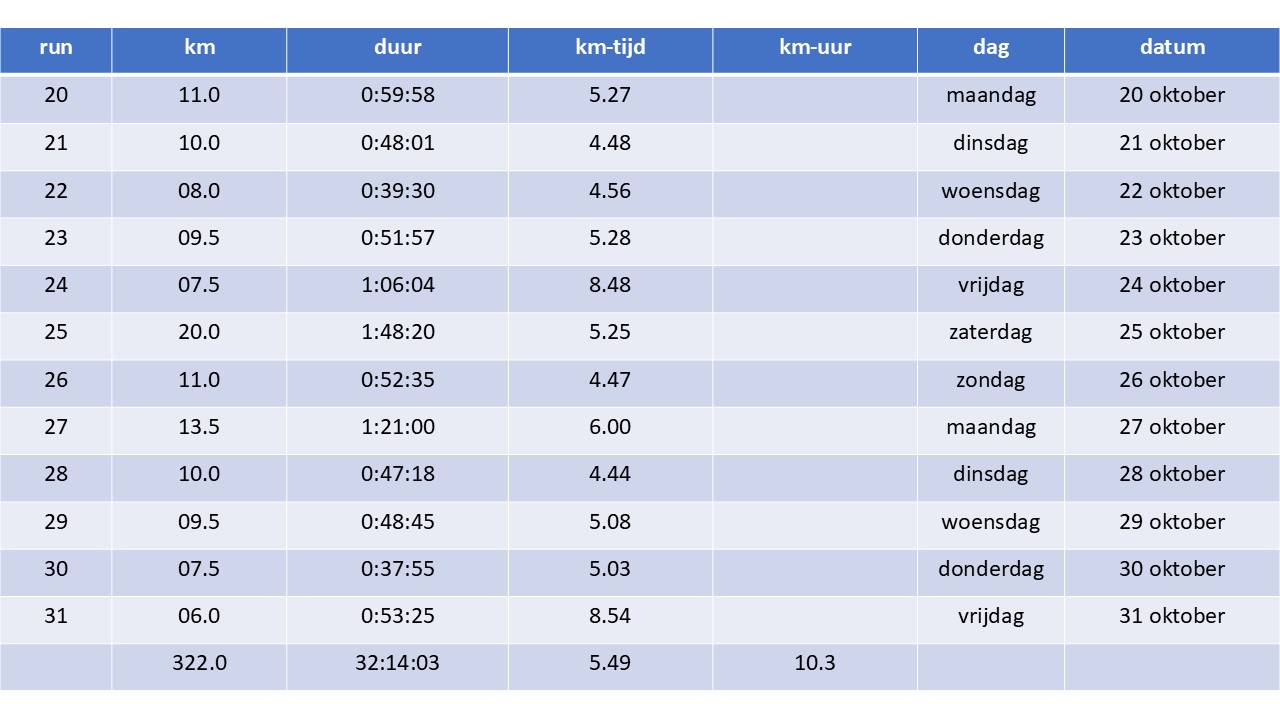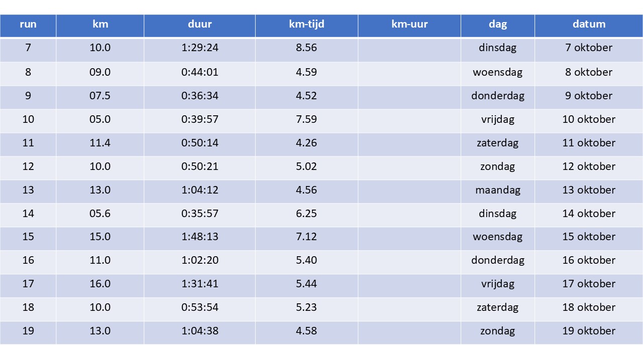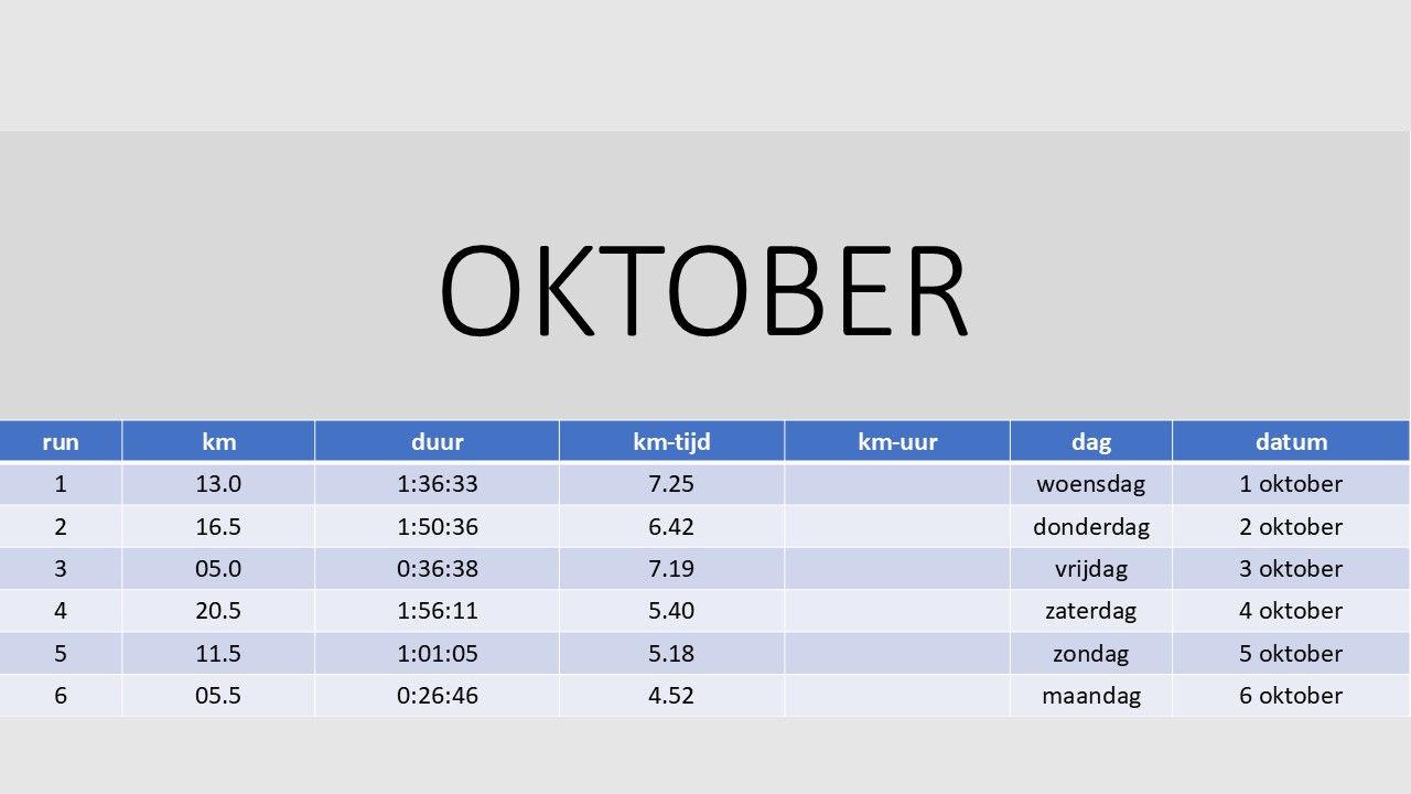 | Het weer. Wisselend tot zwaar bewolkt. Vandaag was het na het optrekken van het lokale ochtendgrijs, wisselend tot zwaar bewolkt. Hier en daar kon er ook wat lichte neerslag vallen. De maxima schommelden tussen 10 en 16 graden. De wind was zwak tot matig uit noord tot noordoost. Actueel. SINTERKLAAS Ninove maakt komaf met roetpieten: “Enkel Zwarte Pieten bij intrede Sinterklaas, anders geen subsidies”. Het stadsbestuur van Ninove kent voor het eerst een structurele subsidie van 2.500 euro toe voor de organisatie van de intrede van Sinterklaas. Daarmee wil het bestuur het evenement, dat jaarlijks honderden kinderen en ouders samenbrengt op de rechteroever, beter omkaderen en de toekomst ervan verzekeren. Al is daar wel één voorwaarde aan verbonden wat betreft de helpers van de Sint. De intrede van Sinterklaas wordt in Ninove jaarlijks georganiseerd door de Ware Sint-Niklaasvrienden. Die intrede van Sinterklaas is niet zomaar een evenement, maar een stukje Ninoofse ziel. Generaties kinderen zijn ermee opgegroeid en dat verdient steun. Met deze subsidie wil men de organisatoren waarderen voor hun jarenlange inzet, maar tegelijk ook zorgen dat het feest veilig, professioneel en toekomstgericht blijft. De klassieke zwarte pieten zullen ook opnieuw deel uitmaken van het kinderfeest. Ninove laat zich niet meeslepen door de woke-waanzin. Wij staan pal voor onze cultuur en onze Vlaamse tradities. De intrede van Sinterklaas is een feest dat mensen samenbrengt, geen onderwerp voor ideologische discussies. Dit stadsbestuur heeft het lef om recht te blijven staan en duidelijk te zeggen waar het voor staat: respect, trots en het behoud van onze Vlaamse identiteit. Dat is wat Ninove groot maakt, en dat blijven we verdedigen. Dus geen roetpieten maar Zwarte Pieten! Eerder kondigde het stadsbestuur ook al aan dat Ninove dit jaar terugkeert naar de “echte kerstsfeer van vroeger”, met een traditionele kerstmarkt van 19 tot 23 december in het stadscentrum, een kerstwandeling, en zangkoren die traditionele kerstliederen zullen zingen. Terug in de tijd: zaterdag 16 oktober 2010. Wedstrijd: Massajogging Meubelen De Olifant – Oostende – 10km250 – 276 deelnemers De laatste wedstrijd van het loopcriterium in Oostende. Het was een beetje afwachten hoe de toch wel zware trainingsweek, met zo’n 90-tal kilometer op de teller, zou verteerd worden. Rond half acht opgestaan. Eerst bij de bakker en de slager langs geweest. Daarna, rond half negen, een beetje gezondigd tegen de goede voedingsregels: een uitgebreid ontbijt met heel wat zoete koffiekoeken en koffie. Voordeel was wel dat ik ’s middags nog geen honger had en niet meer gegeten heb voor aanvang van de wedstrijd. Die startte om 15 uur. Ik had een aangenaam ‘leeg’ gevoel. En ik voelde mij zeker ook niet slecht. Bij de start was het lekker loopweer. Ik ben goed vertrokken aan een voor mij redelijk hoog tempo. Dat beloofde. De wedstrijd liep deels door het toch wel mooie, maar in dit jaargetijde toch wel verraderlijke Maria Hendrikapark. Dit mocht ik trouwens na enkele kilometers reeds ondervinden. Na wat plassen te hebben doorploeterd, wat grasstroken te hebben voorbij gelopen, was het hier en daar wat draaien en keren in het park. Eén van deze bochten nam ik blijkbaar met iets te veel ‘drive’ zodat ik onderuit ging. Een pijnlijke knie en ellenboog waren het gevolg. Toch kon ik vrij vlug hernemen en pogen de achtervolging in te zetten op een groepje waar ik voor mijn val deel van uitmaakte. Ik forceerde niet maar voelde dat ik eerder gemakkelijk het tempo kon volgen. Ik kon terug aansluiten. Ook de tweede ronde liep het vlot. Ik lette nu wel op geen onnodige risico’s te nemen. Ik maakte de tien kilometer vol in een vrij egaal tempo en eindigde in 0:39:06. Enorm tevreden daarmee. Alleen jammer natuurlijk van de val. Na afloop huldiging en uitreiking van de tombolaprijzen in de turnzaal van het plaatselijk schooltje. Heel sympathiek en gezellig. Jeroen liep ook weer een degelijke wedstrijd. Hij eindigde in een tijd van 0:43:51. Uitslag Massajogging De Olifant Oostende. 1   Davy Stieperaere – Varsenare – 1985 – 0:34:33 2   Karel Moerman – Diksmuide – 1985 – 0:35:31 3   Glenn Vermander – Dadizele – 1985 – 0:35:41 4   Dominique Verbeke – Bredene – 1971 – 0:35:53 5   David Thompson (VK) – 1974 – 0:35:53 6   Christof De Simpel – Torhout – 1970 – 0:36:59 7   Timothy Van Belleghem – Assebroek – 1983 – 0:37:19 8   Luc De Ketelaere – Gistel – 1962 – 0:37:21 9   Steven Hocedez – Otegem – 1970 – 0:37:28 10  Christoph Fieuw – Poelkapelle – 1975 – 0:38:01 11  Wim De Coene – Zottegem – 1976 – 0:38:03 12  Christophe Lust – Oostduinkerke – 1977 – 0:38:06 13  Peter Hamers – Oostende – 1969 – 0:38:14 14  Wouter Decock – Westkerke – 1983 – 0:38:21 15  Dirk Boone – Oostduinkerke – 1965 – 0:38:24 16  Frederik Ameloot – Oostende – 1977 – 0:38:33 17  Frederic Debreyne – De Haan – 1971 – 0:38:42 18  Noël Desender – Eernegem – 1959 – 0:39:00 19  Dirk Patoor – Lochristi – 1955 – 0:39:06 20  Gino Puystjens – Lombardsijde – 1962 – 0:39:09 21  Bart Creminger – Oostende – 1992 – 0:39:13 22  Alain Poppe – Oostende – 1962 – 0:39:18 23  Martin Desmedt – Bredene – 1960 – 0:39:21 24  Bram Roekens – Dudzele – 1988 – 0:39:24 25  Koen Tackx – Brussel – 1969 – 0:39:32 26  Hugo Balanck – Zedelgem – 1962 – 0:39:40 27  Johan Deramoudt – 1970 – 0:39:42 28  Jacky Vrancken – Bredene – 1959 – 0:39:49 29  Johan Baert – Jabbeke – 1963 – 0:39:53 30  Johan Watthy – Gistel – 1937 – 0:40:06 31  Pauwel Joos – Kleit – 1966 – 0:40:21 32  Kevin Knockaert – Oudenburg – 1993 – 0:40:26 33  Dirk Vandenberghe – Oudenburg – 1964 – 0:40:36 34  Marino Cobbaert – Bekegem – 1963 – 0:40:47 35  Johan Rammant – Gistel – 1971 – 0:40:51 36  Christ Viaene 