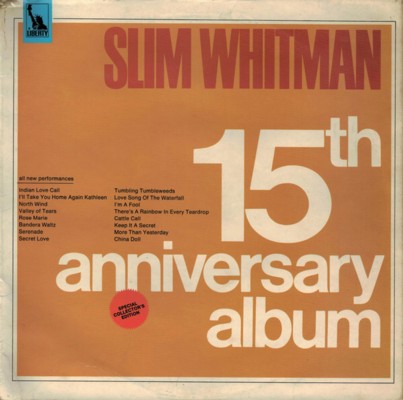 Slim Whitman was een Amerikaanse country singer-songwriter, vooral bekend om zijn herkenbare jodelstijl. In dezelfde platenwinkel (Maison Bleue) stond daar ook een elpee van hem te prijken met als titel '15th Anniversary Album', uitgebracht in 1967. De ondertitel 'SPECIAL COLLECTOR'S EDITION' trok mijn aandacht en voor het bedrag van een single (85 BEF) mocht ik de plaat mee naar huis nemen. Hier betrof het geen originele uitgave jammer genoeg, maar een heruitgave uit 1972.