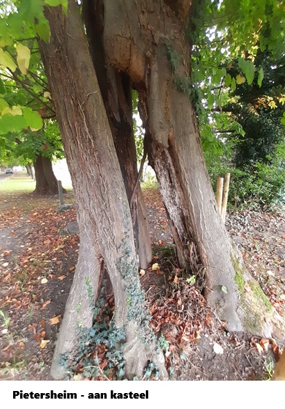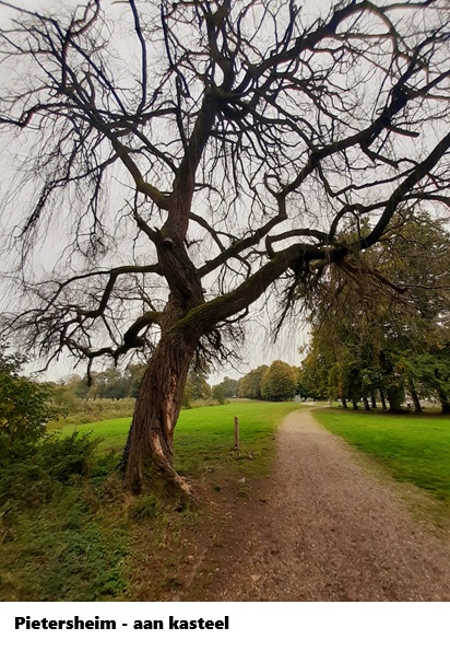 Daarna zag ik op de Neerharenweg 'n voortuin in aanbouw voor halloween. En dat huisje in de speeltuin, ... dat is een der dingen die zo ineens opduiken. Blijkbaar werkt daar 'n creatieve geest. Via de grachten rond de ruïne en het kasteel kwam ik aan die iconische boom, 'n treurwilg. De boom is ziek en zal gekapt worden. Wat verderop kun je dwars doorheen 'n andere boom kijken. Nochtans staat de boom nog volop in het blad, 'n teken dat de sapstroom nog goed zit.