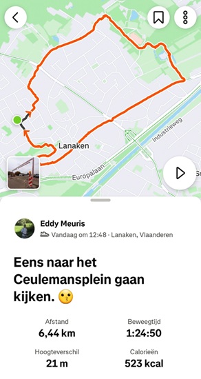 Voorwaar 'n straffe prestatie, al zeg ik het zelf. Die wandeling die ik vandaag maakte, mag gezien worden. Na de triomf van onze Remco gisteren in Kigali - waarbij hij toch maar eventjes Tadej Pogacar op zijn nummer zette - kon ik niet achter blijven, zij het dat mijn sportieve prestatie uiteraard nog niet aan de enkels komt van onze toprenner. Maar met 'n gemiddelde van 6,16 km/uur over 'n afstand van 18,79 km. mag ik toch pronken. Ik begin hoe langer hoe meer, goesting te krijgen in die langere wandeltochten.
