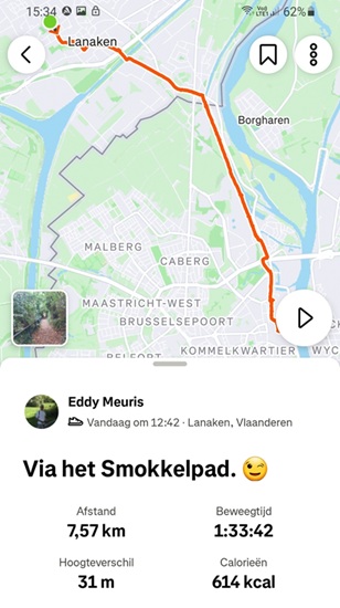 Nadat ik mijn krantje had afgehaald zag ik dat het hoogtijd was om terug naar huis te keren. Niet dat deze jongen moe of uitgeput was, nee, mijn gsm gaf aan dat er nog maar 'n paar % power voorradig was. Dat heb je natuurlijk als je dat ding 's morgens vergeet op te laden. Ik heb het juist gehaald, eens thuis gaf mijn telefoon de geest en kon hij direct aan de beademing. Ik had nog juist mijn Strava-app kunnen stopzetten.