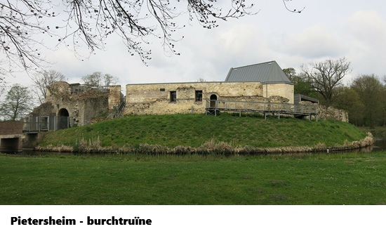 Terugkeren deed ik via Pietersheim. De laatste foto's maakte ik in de dreef met oa. dat ingebouwde kabouterhuisje en tot slot de burchruïne. Voila, in plaats van te fietsen was het 'n stevige wandeling van +/- 19,5 km. Ik heb mij geamuseerd, niet gelanterfant en genoten van de natuur. Uiteindelijk is het volledig droog gebleven met soms 'n streep zon, maar de secundaire wegen bleven nat, ook omstreeks 16u30. Nee, 'n natte kont heb ik vandaag gelukkig aan mij voorbij laten gaan. We zien wel wat het weer geeft de volgende dagen.