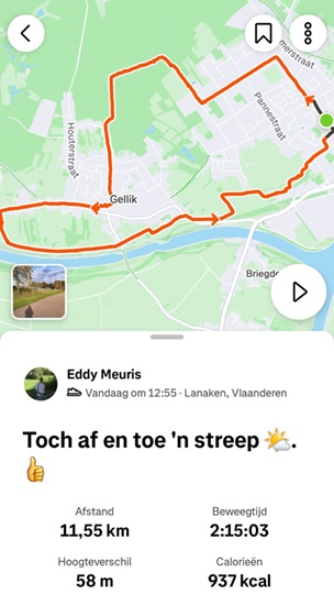 Nadat ik mijn krantje had afgehaald zag ik dat het hoogtijd was om terug naar huis te keren. Niet dat deze jongen moe of uitgeput was, nee, mijn gsm gaf aan dat er nog maar 'n paar % power voorradig was. Dat heb je natuurlijk als je dat ding 's morgens vergeet op te laden. Ik heb het juist gehaald, eens thuis gaf mijn telefoon de geest en kon hij direct aan de beademing. Ik had nog juist mijn Strava-app kunnen stopzetten.