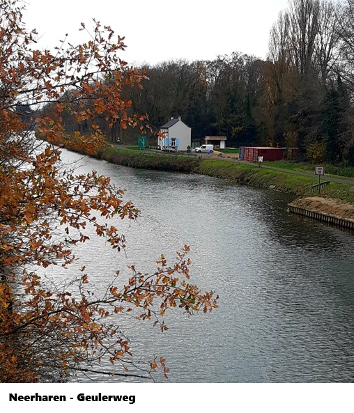 Op die weg nam ik twee foto's aan dezelfde boom, éénmaal met de lens naar de zon toegekeerd en de andere met de zon in de rug. Een heel verschil hè. Wat verderop 'n gedenkplaats over de Romeinse Weg. En dan kom je aan de brug van Vroenhoven met de bunker die ze gered hebben bij de bouw van de nieuwe brug. Je kunt daar 'n interessant museum bezichtigen, 'n deel is gewijd aan WO II en 'n ander deel aan de kanalen en de binnenvaart. Tevens is er ook 'n horecazaak. Een aanrader dus. Op te merken is ook dat 'n belangrijke wielerwedstrijd al verschillende keren daar aan de brug vertrokken is, de Reniwi Tour.
