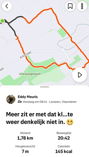 Met 'n tempo van +/- 5,9 km/uur over 18 km. kan ik uiteraard zéér tevreden zijn. Ik deed er juist iets meer dan drie uur over. In Lanaken dronk ik mij nog ene warme cécémel. Alcohol was uit den boze, deze jongen had tijdens het middageten al gezondigd. Ik ken mijn limieten. Morgen vermoedelijk weer 'n wandeling, op woensdag ga ik denkelijk fietsen.