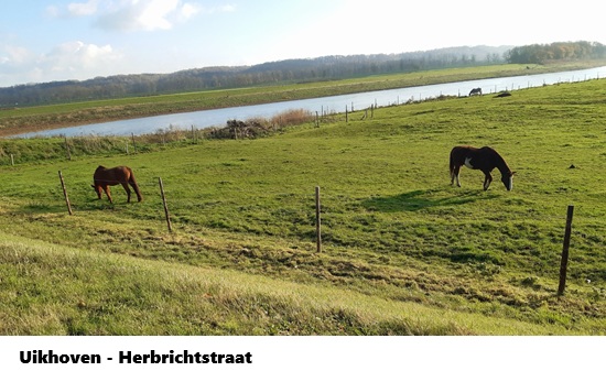 Maar dit verslag gaat eigenlijk over mijn fietstocht. Ik wilde naar Kotem fietsen om daar de brug over te steken naar Stein en om dan terug te keren via Meerssen en Maastricht. In Herbricht, ’n gehucht van Lanaken, zag ik dat het café van Rudi, nu helemaal tegen de vlakte ligt. Rechts wonen de twee laatste bewoners. Daarna reed ik naar Uikhoven waar de paarden grazen langs de Maas. Vervolgens heb je Kotem met weidse vergezichten.