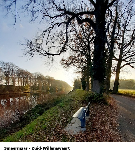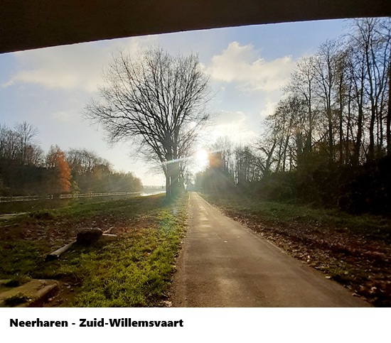 Op die weg nam ik twee foto's aan dezelfde boom, éénmaal met de lens naar de zon toegekeerd en de andere met de zon in de rug. Een heel verschil hè. Wat verderop 'n gedenkplaats over de Romeinse Weg. En dan kom je aan de brug van Vroenhoven met de bunker die ze gered hebben bij de bouw van de nieuwe brug. Je kunt daar 'n interessant museum bezichtigen, 'n deel is gewijd aan WO II en 'n ander deel aan de kanalen en de binnenvaart. Tevens is er ook 'n horecazaak. Een aanrader dus. Op te merken is ook dat 'n belangrijke wielerwedstrijd al verschillende keren daar aan de brug vertrokken is, de Reniwi Tour.