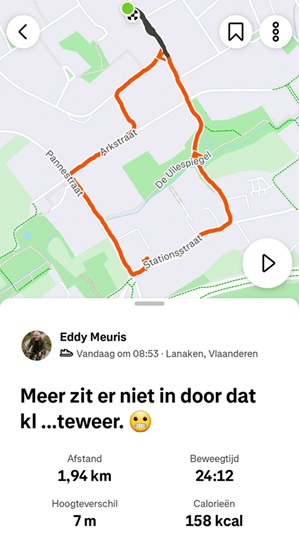 Het was deze morgen precies een voorgevoel dat ik had, zou ik misschien toch al mijn strava-app activeren ....??? Ik had al effe moeten wachten om naar de bakker te gaan wegens de regen, en het leek mij 'n dag te worden vol met buien en gemiezer.