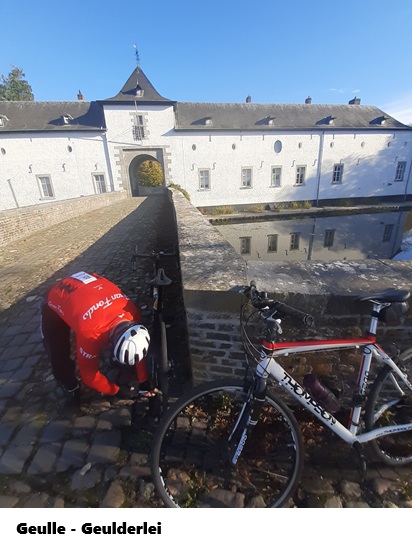In Meeswijk was ik tot mijn verwondering, de enige passagier op het veer naar Berg a/d Maas. Aan de overkant van de Maas, stonden wel enkele voertuigen en fietsers te wachten om naar België te rijden. Via Stein en de steeds weerkerende zon, pal op mijn gezicht, kwam ik toe ik Geulle. Daar werd ik om assistentie gevraagd bij 'n andere wielertoerist die geen fietspomp bijhad. Hij stond juist aan dat mooi kasteel.