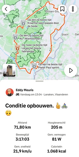 Op dat punt ben ik even gaan spieken op mijn gsm voor het uur en de tot daartoe al afgelegde kms. Ik had nog tijd en vooral goesting om met 'n omweg terug naar Lanaken te fietsen. Ik reed eerst doorheen Zutendaal, dan kwam ik in Eigenbilzen om tenslotte in Gellik wel te pauzeren op die plek waar ik gisteren voor 'n gesloten deur stond. Daarna reed ik nog door Kompveld om uiteindelijk thuis te zien dat ik vandaag flink mijn best had gedaan. 71 km. aan 'n tempo van 21,9 km/uur. Niet slecht. Ik noemde het op Strava "conditie opbouwen", maar eigenlijk mag ik niet klagen over die conditie. Nog 'n goed weekend iedereen.