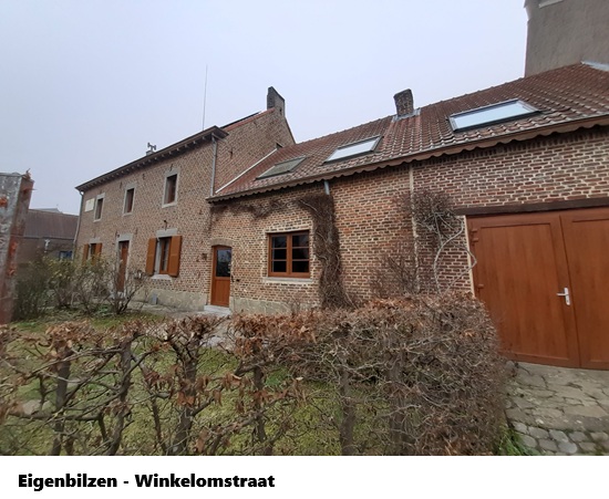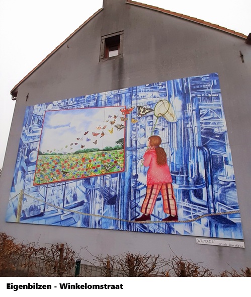 Ik vertrok om 13u17 met de bus naar Eigenbilzen. Daar stapte ik aan de kerk uit. In de Winkelomstraat zie je ook enkele historische woningen, oa. "bij Cajé", 'n dubbel herenhuis uit 1825. Waar je ook niet langs kon kijken, dat was die mooie muurschildering.