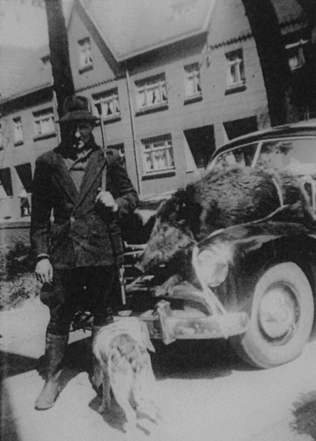 KLIK op de FOTO : een beeldje uit de presentatie : Willem Ignoul komt aan met een geschoten everzwijn , vastgebonden op de "kap" van de auto...: Lanklaar begin jaren'60...