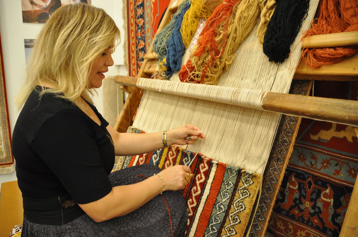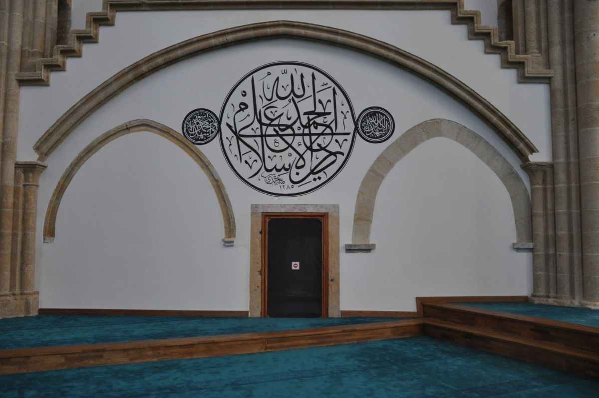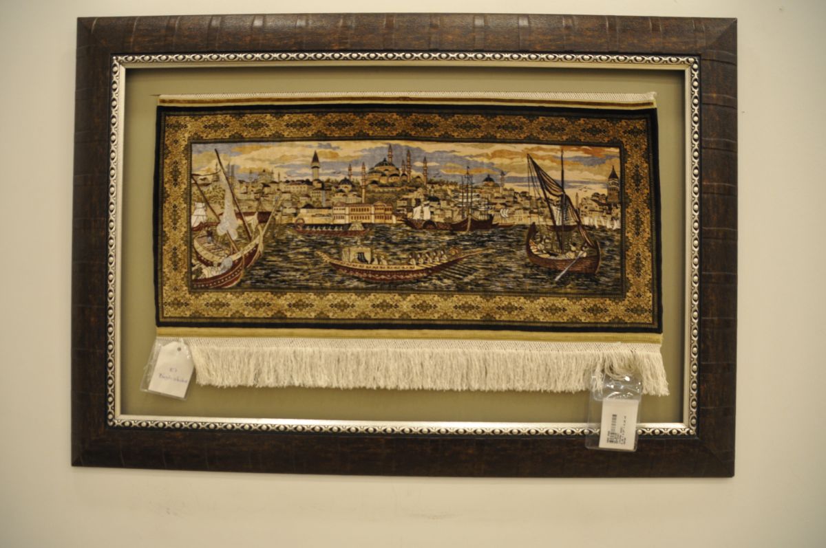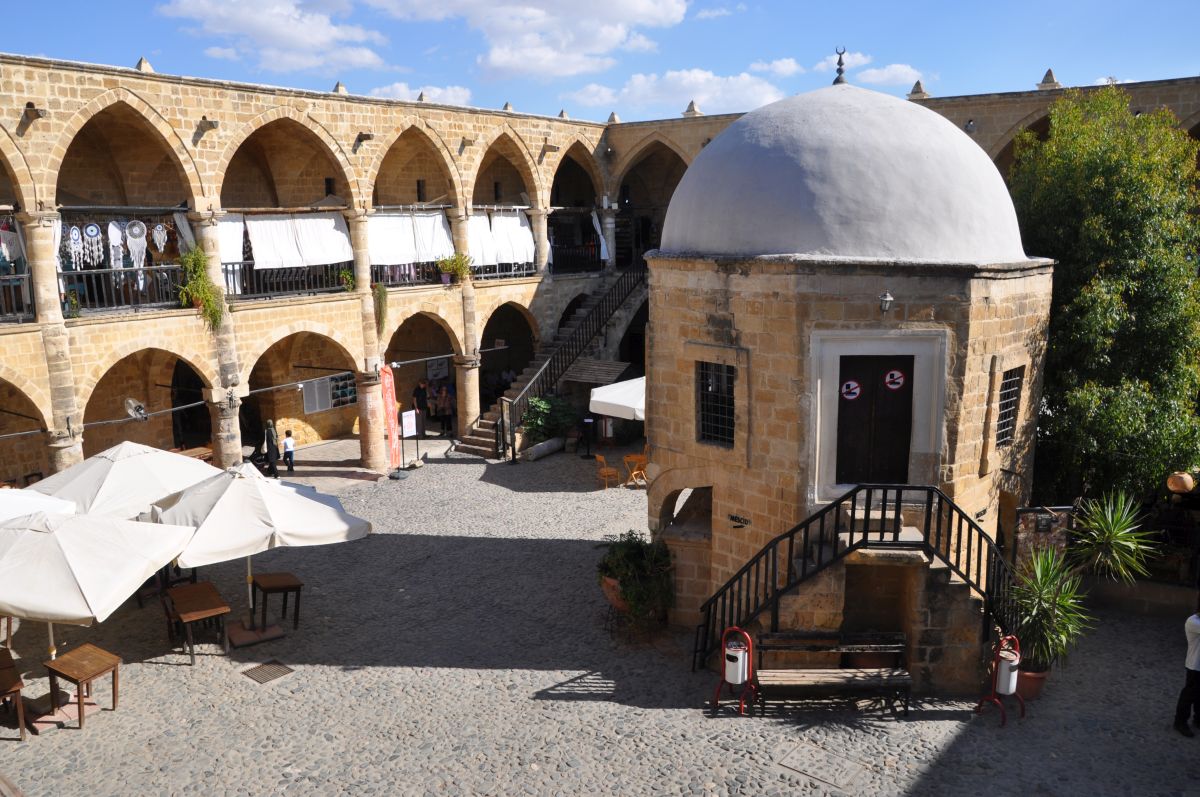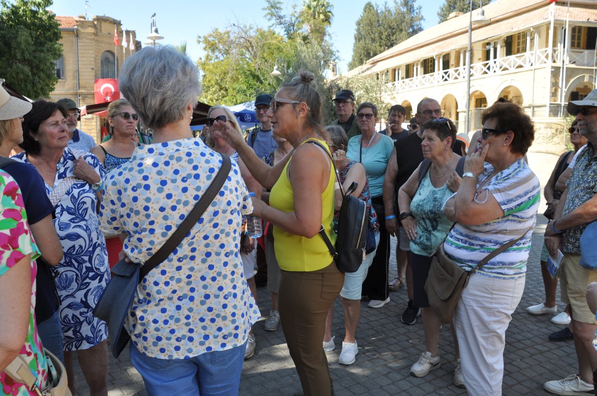 De goedkope RSD-reizen worden mede gefinancierd door verkopers van geknoopte tapijten, edelstenen en leren jassen, en vandaag waren we een tijdje in de tapijtengroothandel zoet - ze hebben daar ook sommige echte kunstwerken. Vandaar reden we naar de hoofdstad Lefkosa (Turkse én Griekse naam!), in het buitenland als Nikosia bekend: je ziet onze gids Guldal in volle actie. We staken voor een uurtje de grens naar Zuid-Nikosia in de Republiek Cyprus over ("Checkpoint Charlie") maar waren al dra weer terug in het iets minder commerciële Noordelijke deel, waar we de grote Han (ofte karavaanserail) bezochten, evenals de grote Selimiye-moskee die lang geleden als katholieke kathedraal gebouwd was; en dan wandelden we nog een tijdje langs de stadsmuren (het sportveld wat je ziet bevindt zich in de bufferzone van de Verenigde Naties) en liepen tenslotte nog eventjes doorheen een islamitische tegenhanger van een begijnhof.