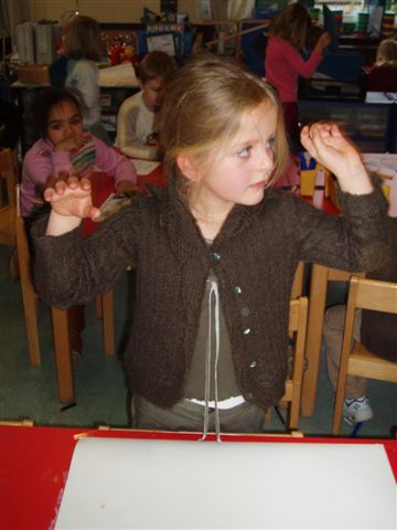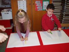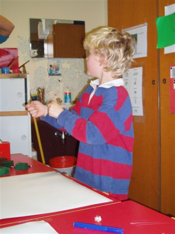 terwijl een groep zijn tanden aan het poetsen was deden de andere kleuters werkjes. Een groepje was druk in de weer met het maken van een poetskalender.