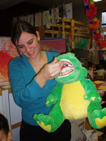 JA.....ja.....tanden poetsen is altijd een beetje leuk. de rakkers van juf Christelle hadden hun attributen alvast meegebracht naar school. Juf Annelies gaf een demostratie met een Kroky de krokodil