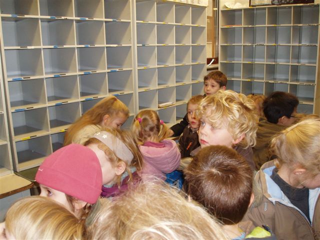 Na de dolle pret even concentratie. De postmeester legde uit wat de postbode's hier 's nachts deden. Al de brieven moeten hier gesorteerd worden . Zo staat alles klaar voor de postbode om 's morgens de brieven bij de mensen te brengen.