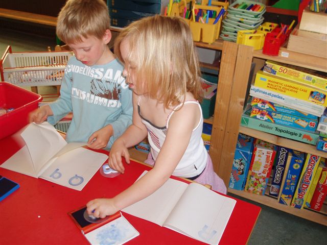 en let op .... ze moeten in de juiste volgorde staan. Soms zat er wel eens een foutje in daar ze hun letterstempel niet juist vast hadden. Resultaat de b was dan een d of de p werd opeens q...... Maar door praten en kijken wisten de kinderen al snel wat er fout liep....