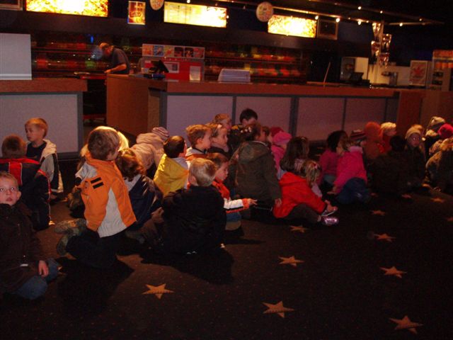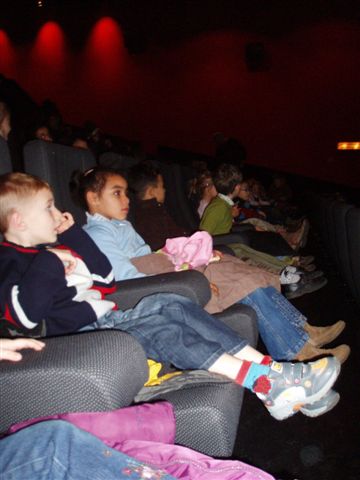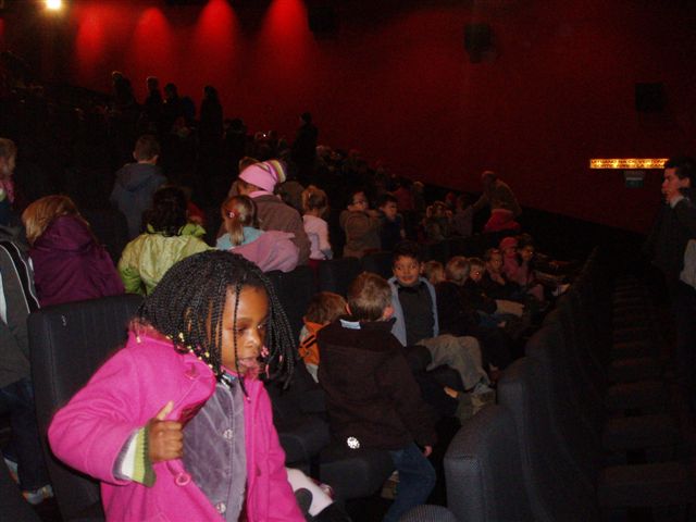Woensdag 6 december. Een prachtig zicht...de kinderen kwamen de school binnen gewandeld zonder schooltas. Ja die hadden ze vandaag niet nodig want van Sinterklaas kregen alle kinderen van de school een prachtig geschenk. Ze mochten naar de film. Bij het belgerinkel vertrokken alle kinderen richting westrand waar 8 bussen op ons stonden te wachten. De grote waren heel erg in de weer om onze kapoentjes naar de westrand te begeleiden.